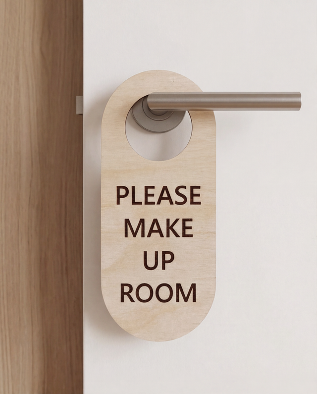 Denne enkle, men elegante dørhænger er lavet af birketræ og har teksten "Please Make Up Room" omhyggeligt indgraveret i træet. Det naturlige birketræ giver et varmt og indbydende udseende, mens det minimalistiske design sikrer, at beskeden er tydelig og let forståelig.