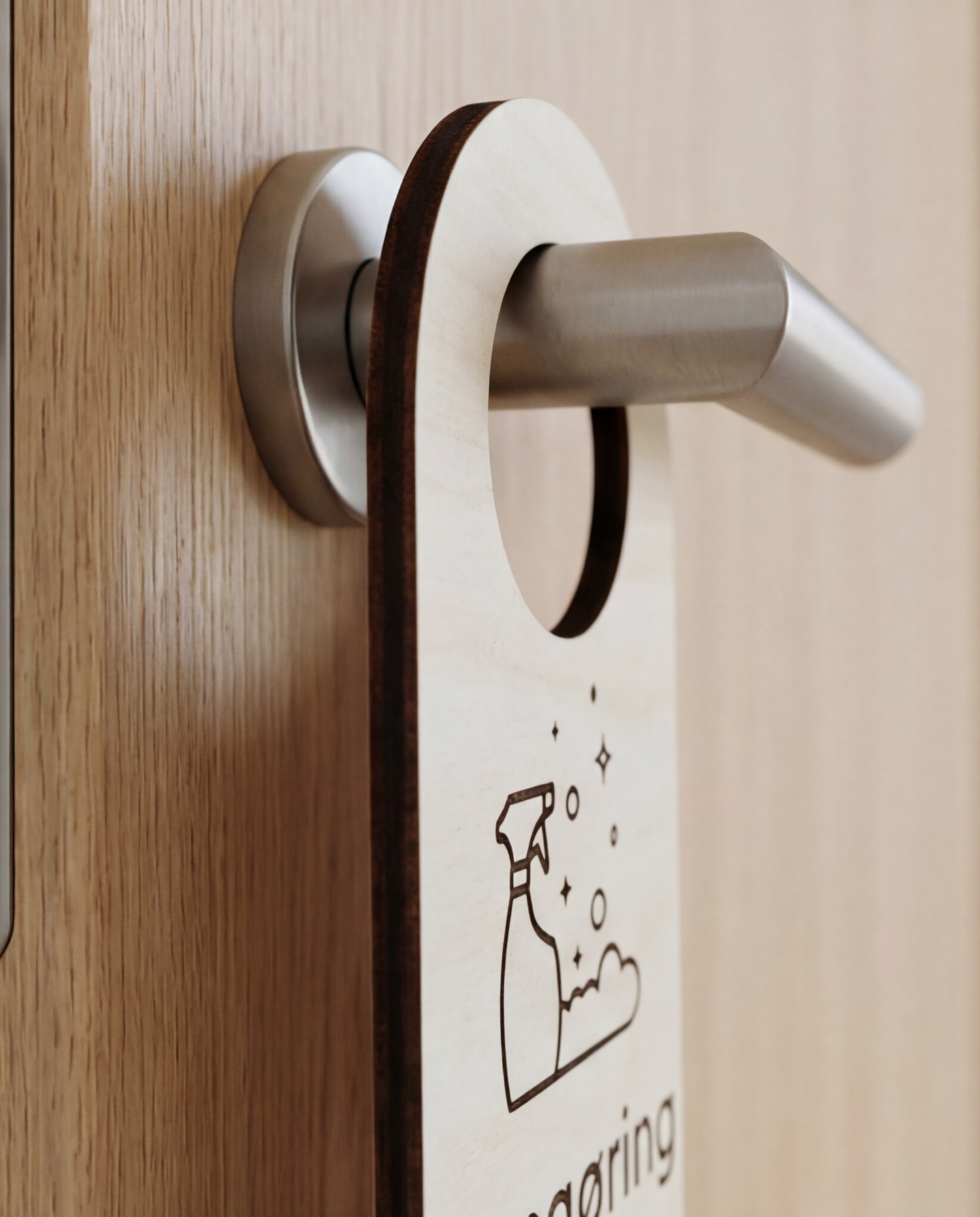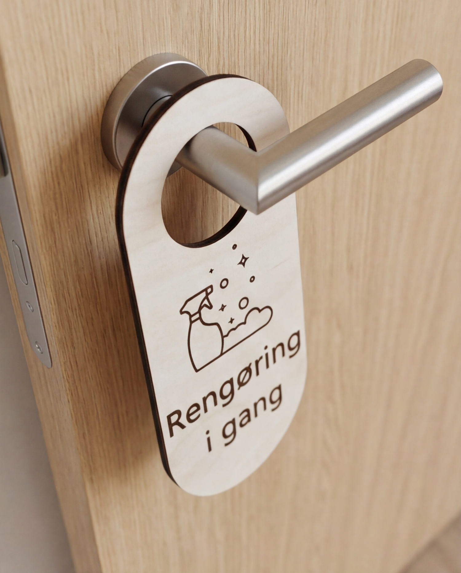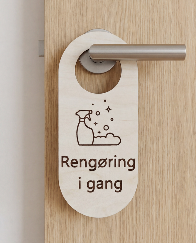 Når der bliver gjort rent, skal gæsterne vide det – men det behøver ikke være med en plasticskilt i skærende farver. Vores "Rengøring i gang" dørhænger er lavet i ægte birkekrydsfiner med en professionel mat overflade, der passer perfekt ind i ethvert miljø.