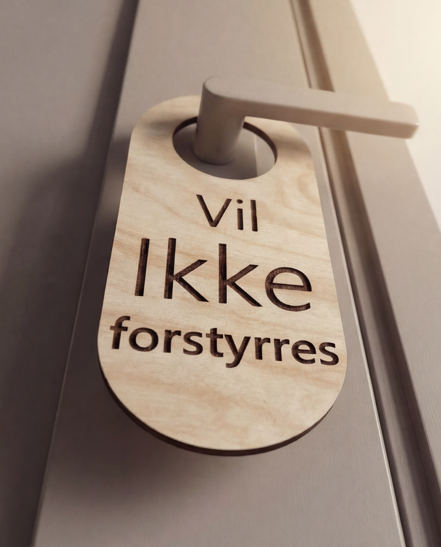 Denne dørhænger i birketræ med teksten “Vil Ikke Forstyrres” gør det let at markere, når du har brug for ro. Hvad enten det handler om fordybelse, møder, online samtaler eller bare uforstyrret tid, giver den et klart signal uden at virke hård eller afvisende.