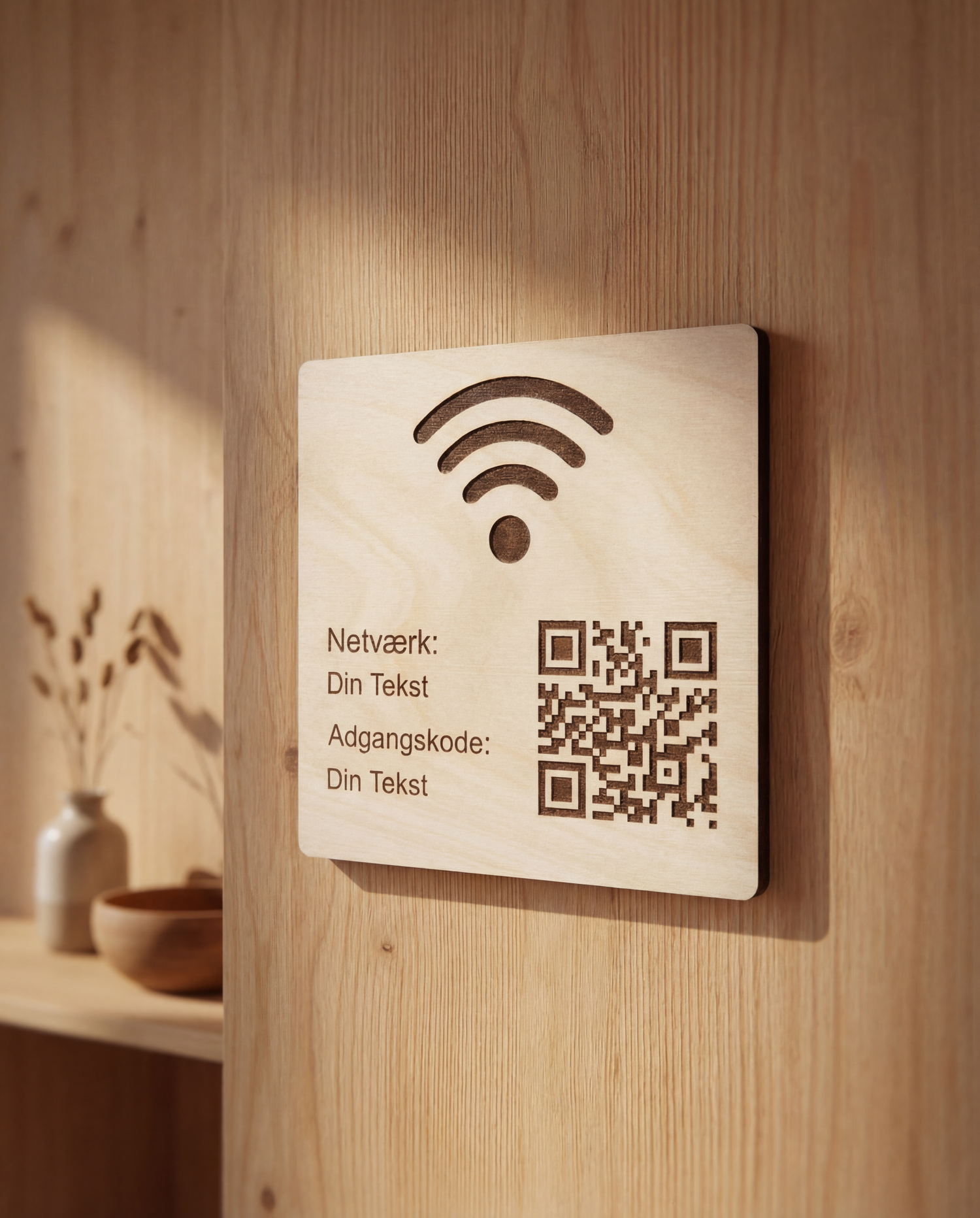 Dette WiFi-skilt er skabt til hjem og steder, hvor indretningen betyder noget. Det enkle udtryk og det lyse træ giver en rolig, nordisk stemning, mens QR-koden gør adgangen enkel og ubesværet for gæster. Ingen løse papirer, ingen midlertidige løsninger – bare en diskret og gennemtænkt detalje.