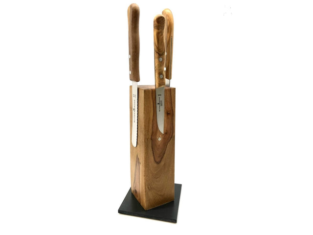 Hver knivblok er lavet af førsteklasses oliventræ, kendt for sin holdbarhed og smukke naturlige åremønstre. Den slanke tårndesign sikrer, at dine knive opbevares vertikalt, hvilket sparer plads og giver nem adgang til dine vigtigste køkkenredskaber.