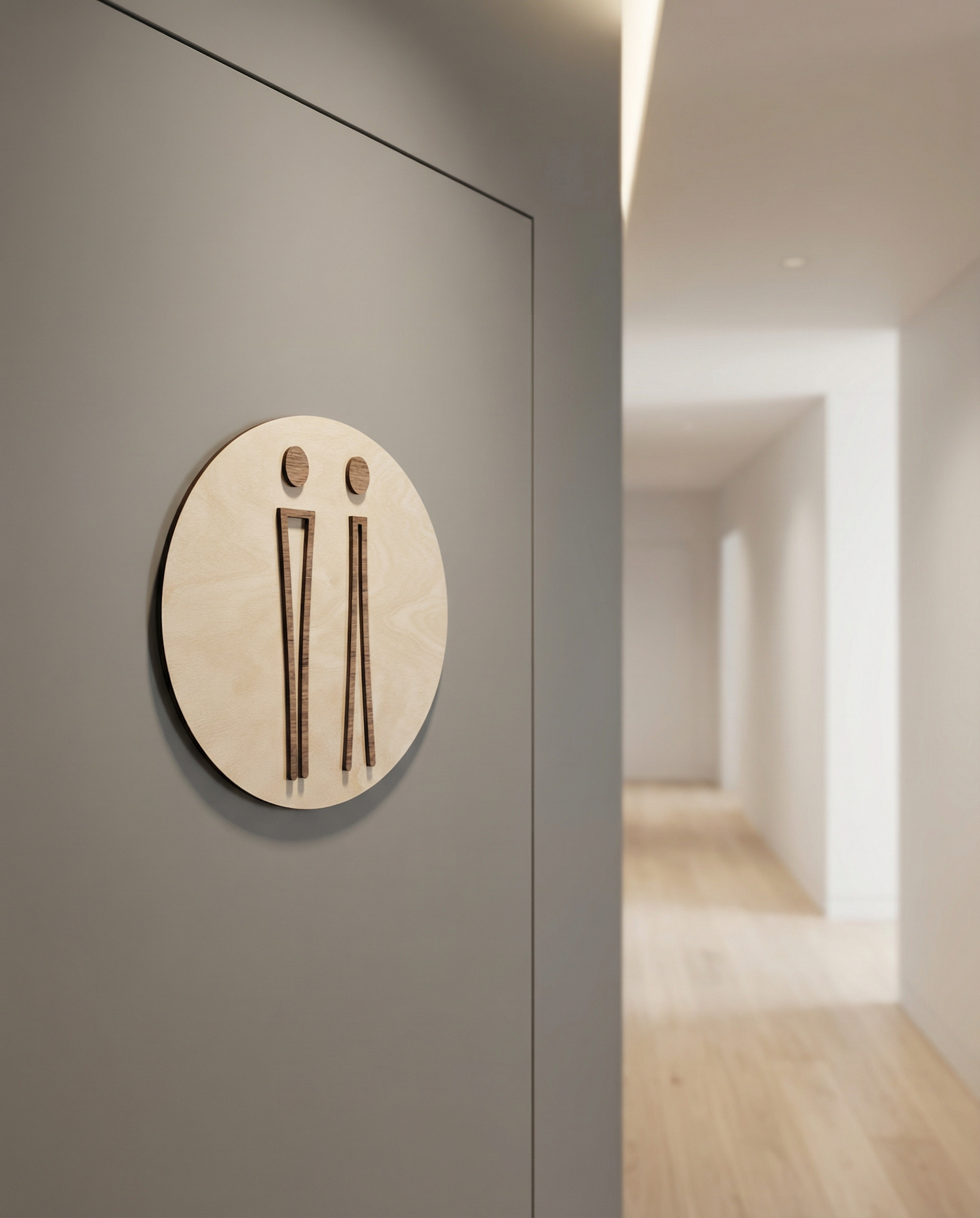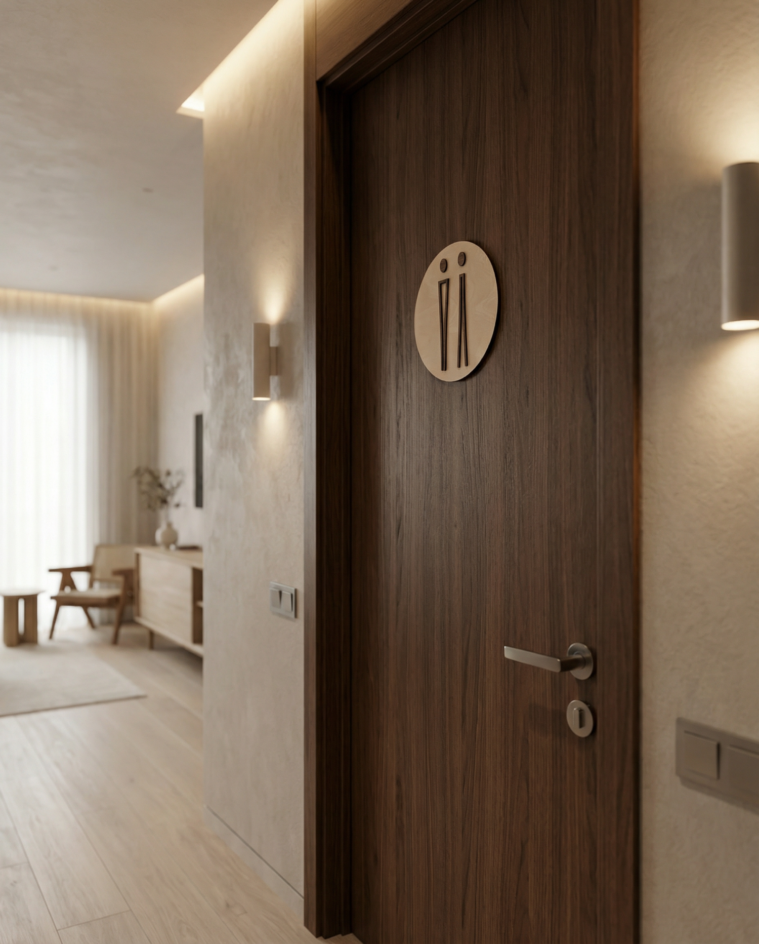 Dette toiletskilt er skabt til dem, der bevidst vælger ægte materialer frem for plastik, klistermærker og kolde metalskilte. Træ har en rolig, naturlig tilstedeværelse – og netop derfor føles dette skilt som en del af rummet, ikke blot en praktisk markering.