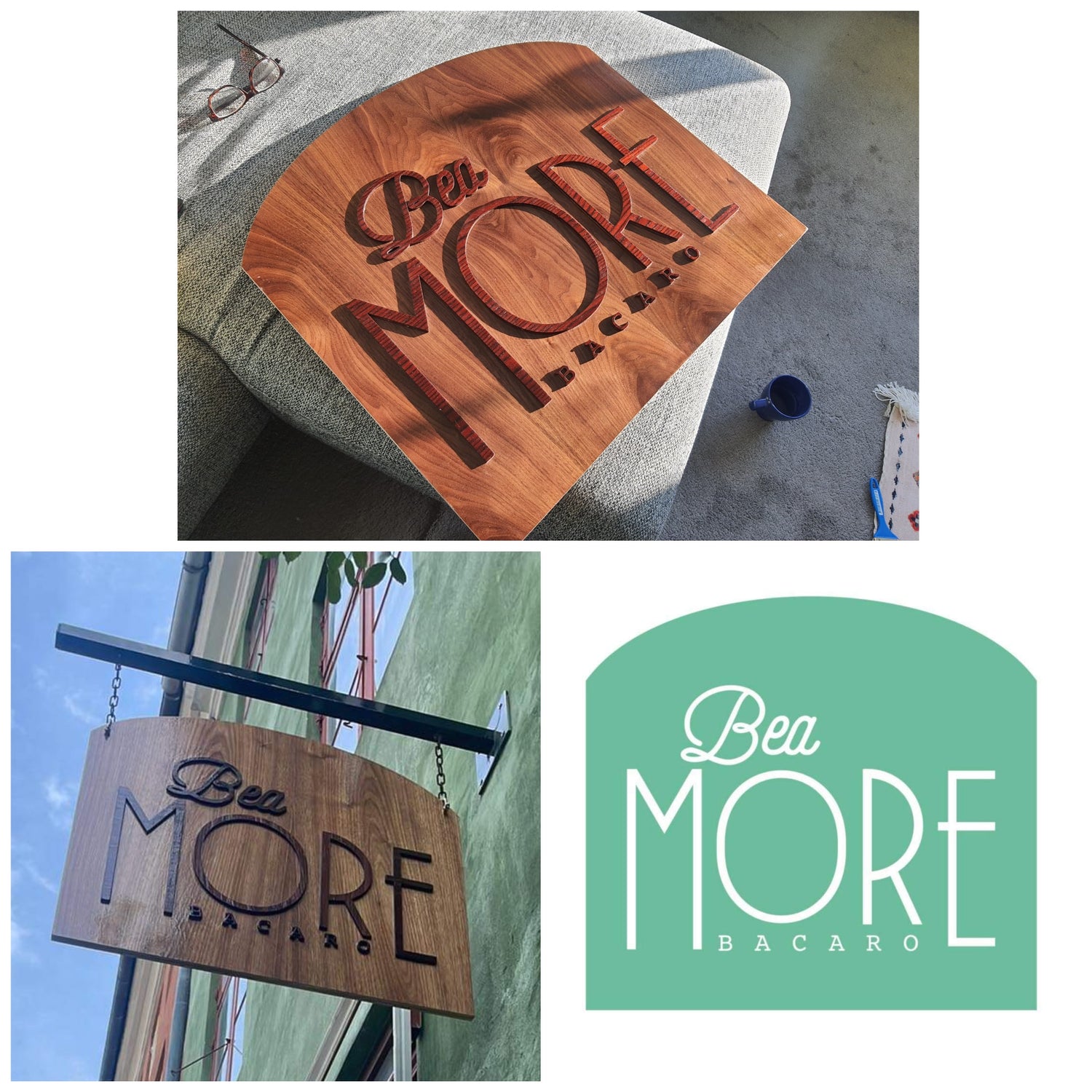 Billede eller logo/silhuet kan ses i billedet tilsendt. Kunden sendte os et logo, valgte træsort for teksten (palisander) og til baggrunden (valnød krydsfiner). Dernæst blev størrelsen beskrevet (højden) og efterspurgte slutteligt en lakbehandling til udendørs brug. Og det var det 😊. Så simpelt kan det gøres.